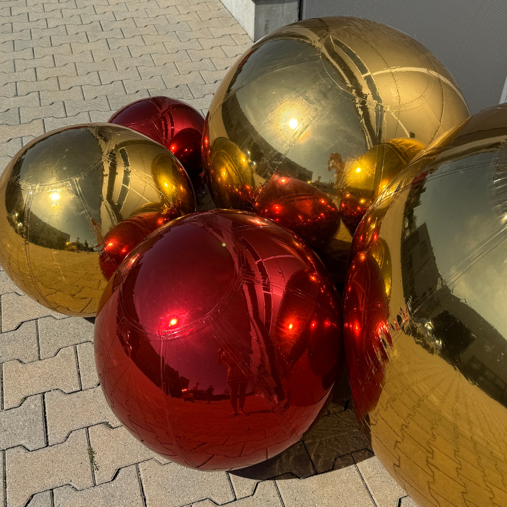 ⚠️ Die goldenen Kugeln solltest Du nicht in direkter Sonneneinstrahlung platzieren, da sie sich bei Hitze verformen oder platzen können. Befülle sie im Zweifel mit etwas weniger Luft, da sich diese bei Erwärmung ausdehnt.